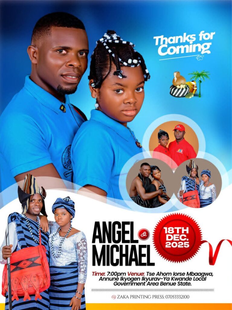 The couple, Michael and Angel, are set to wed on December 13, 2025 in Kwande Local Government Area of the state.